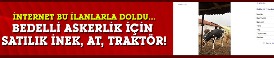 'Çerkezköy ve Kapaklı bölgesinde 2 arsa, piyasanın 15 bin lira aşağısında, bedelli askerlik için acil satılıktır', '7 yaşında. Arabaya da koşar. Çok uysal bakımlı güzel bir dişi at. Ormana gider, eşinizi dostunuzu gönül rahatlığıyla bindirebilirsiniz', 'Tertemiz hiçbir çiziği, hasarı olmayan çok memnun olduğum motorumu askerlikten dolayı satıyorum. Alana hayırlı olsun.'