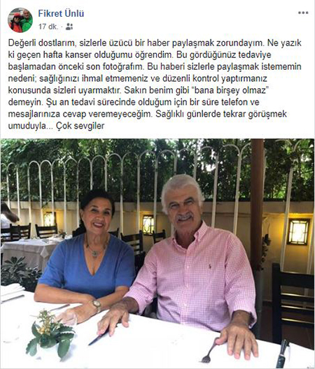 “Değerli dostlarım, sizlerle üzücü bir haber paylaşmak zorundayım. Ne yazık ki geçen hafta kanser olduğumu öğrendim. Bu gördüğünüz tedaviye başlamadan önceki son fotoğrafım. Bu haberi sizlerle paylaşmak istememin nedeni; sağlığınızı ihmal etmemeniz ve düzenli kontrol yaptırmanız konusunda sizleri uyarmaktır. Sakın benim gibi “bana bir şey olmaz” demeyin. Şu an tedavi sürecinde olduğum için bir süre telefon ve mesajlarınıza cevap veremeyeceğim. Sağlıklı günlerde tekrar görüşmek umuduyla... Çok sevgiler.”