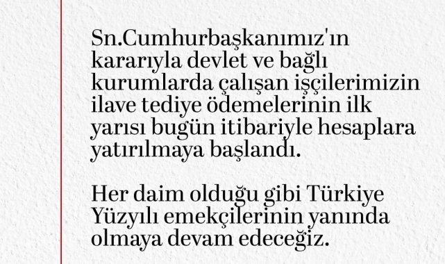 Çalışma ve Sosyal Güvenlik Bakanlığının sosyal medya hesabından yapılan açıklamada, "Cumhurbaşkanı'mızın kararıyla devlet ve bağlı kurumlarda çalışan işçilerimizin ilave tediye ödemelerinin ilk yarısı bugün itibarıyla hesaplara yatırılmaya başlandı. Her daim olduğu gibi Türkiye Yüzyılı emekçilerinin yanında olmaya devam edeceğiz" ifadelerine yer verildi.