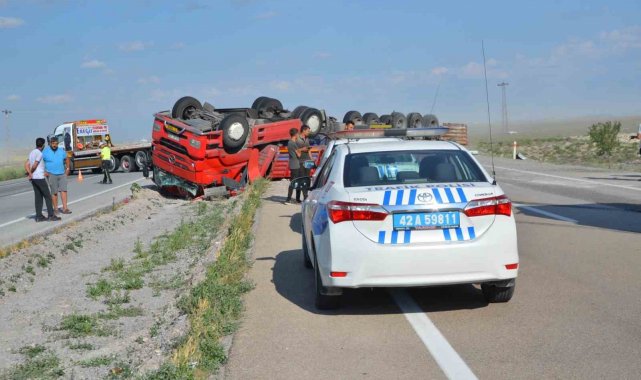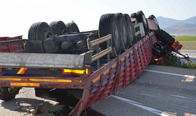 Konya'nın Karapınar ilçesinde traktör taşıyan tırın kontrolden çıkarak refüje devrilmesi sonucu 1 kişi yaralandı.