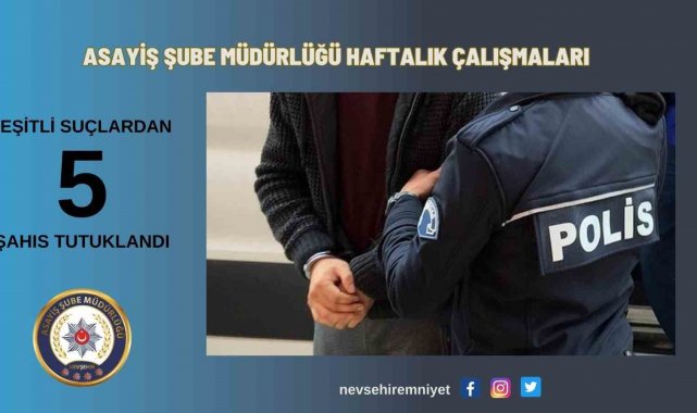 Edinilen bilgiye göre, İl Emniyet Müdürlüğü Asayiş Şube Müdürlüğü ekipleri Nevşehir Cumhuriyet Başsavcılığı koordinesinde yapılan çalışmalarda gözaltına alınan 5 şahıs tutuklandı. Haklarında çeşitli suçlardan dolayı yakalama ve UYAP araması bulunan 9 şahıstan 4'ü serbest bırakılırken 5 şahıs ise çıkarıldıkları adli makamlarca tutuklandı.