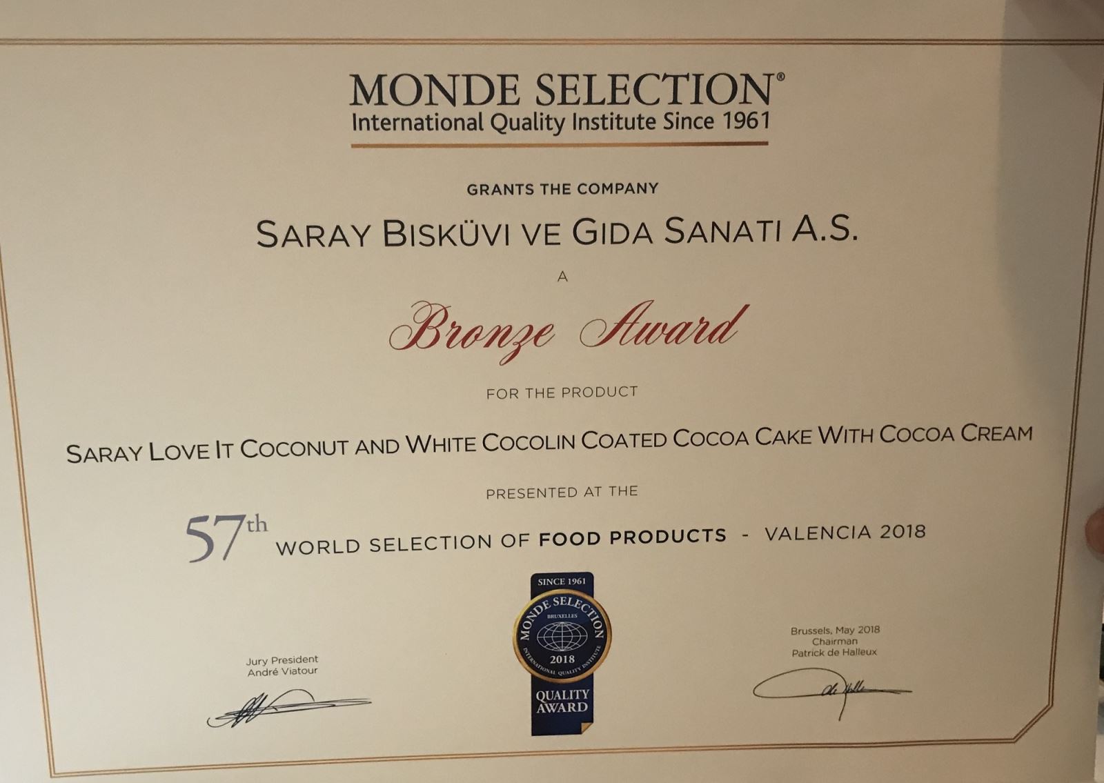 Yenilikçi ve lezzetli ürünleriyle Türkiye’nin sevilen atıştırmalık markası Saray Bisküvi, Belçika merkezli “Uluslararası Kalite Enstitüsü Monde Selection” tarafından kalite ve lezzet dalında ödüllendirildi. Bu yıl 92 ülkeden 1012 markanın katıldığı yarışmada Saray Bisküvi, Türkiye ve dünyanın pek çok ülkesinde tüketicilerin severek tükettiği LoveIt markasının keki ile bronz ödüle layık görüldü. Saray Bisküvi, LoveIt keki ile kazandığı bu ödülle uluslararası arenada kalitesini bir kez daha tescillemiş oldu. Şirket, geçen yıl da Offtime ürünüyle üstün lezzet ödülüne layık görülmüştü.