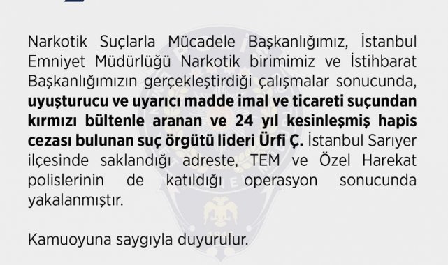 Emniyet Genel Müdürlüğünden yapılan açıklamaya göre, Narkotik Suçlarla Mücadele Başkanlığı, İstanbul Emniyet Müdürlüğü Narkotik birimi ve İstihbarat Başkanlığının gerçekleştirdiği çalışmalar sonucunda Uyuşturucu ve uyarıcı madde imal ve ticareti suçundan kırmızı bültenle aranan ve hakkında 24 yıl kesinleşmiş hapis cezası bulunan suç örgütü lideri Ürfi Ç. İstanbul'un Sarıyer ilçesinde saklandığı adreste TEM ve Özel Harekat polislerinin de katıldığı operasyon sonucunda yakalandı.