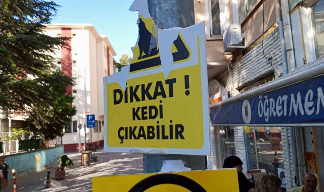 Eskişehir'deki bir ara sokakta sürücülerin çok fazla sürat yapması ve araçların sıkça kedilere çarpması sebebiyle bölge esnafı tarafından ışık direğine asılan "Dikkat Kedi Çıkabilir" yazılı plastik uyarı levhası kimliği belirsiz şahıslar tarafından yırtıldı.